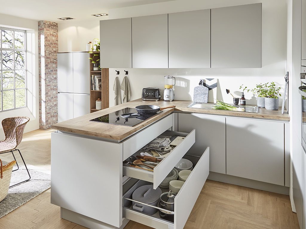 Luxe greeploze keuken in zijdegrijs. De keuken is in alle mogelijke opstellingen leverbaar en wordt nieuw geleverd inclusief: werkblad, spoelbak en Grundig inbouw apparatuur. De keuken wordt standaard geleverd met de getoonde apparatuur. Uiteraard zijn zowel de apparaten als de merken aan te passen aan je wensen.