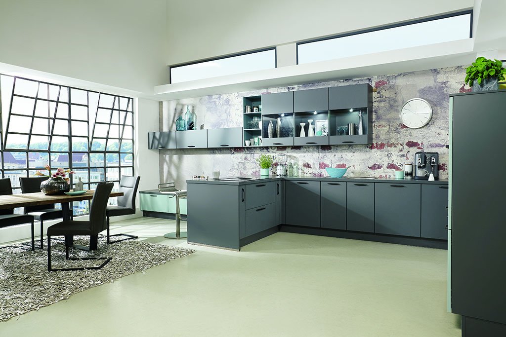 Luxe keuken in schiefergrijs. De keuken is in alle mogelijke opstellingen leverbaar en wordt nieuw geleverd inclusief: werkblad, spoelbak en Grundig inbouw apparatuur. De keuken wordt standaard geleverd met de getoonde apparatuur. Uiteraard zijn zowel de apparaten als de merken aan te passen aan je wensen.